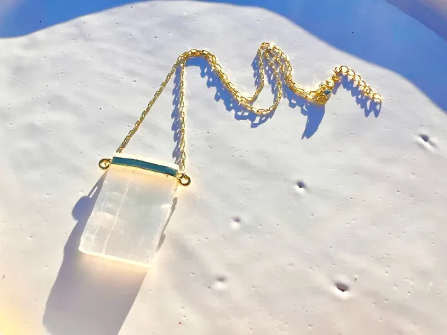 Vibrate the energy of crystals with Mimppy's Zen necklace. Selenite is a very powerful stone, connecting with higher vibrational planes and very effective in cleansing the auric field. It enhances any type of energy work, personal intentions, and the energy of other stones. It can be used to cleanse and energize other stones.