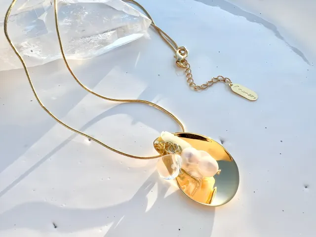 Vibrate the energy of crystals with Mimppy's Concha necklace. Pearls, unlike crystals, are not minerals, but they have healing and purifying properties. They can help reduce stress, anxiety, and illness. They also help awaken creativity. Aquamarine clarifies and softens communication, helps with anxiety, and helps refine sensitivity and intuition. It calms and soothes the mind. Crystal quartz is a powerful source of energy and raises the vibrational frequency of those who approach or come into contact with it, offering powerful healing properties.